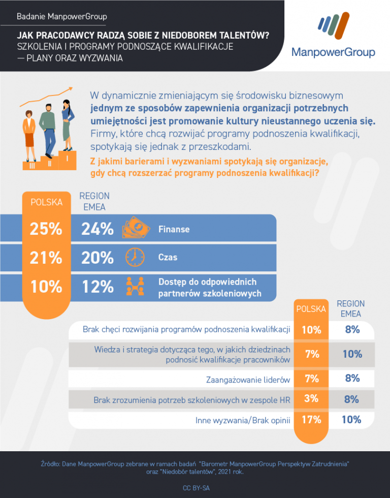 Wdrażane przez polskich przedsiębiorców metody przyciągnięcia najlepszych kandydatów różnią się od tych stosowanych przez organizacje z regionu EMEA. Zagraniczni pracodawcy z tego obszaru są zdecydowanie mniej skłonni, by pozyskiwać nowych pracowników poprzez systemy poleceń (21%) i podwyższanie stawek (32%). Zamiast tego wolą zaoferować kandydatom bardziej elastyczne godziny pracy (41%). Są jednak także podobieństwa: w regionie EMEA szkolenia, rozwój umiejętności i opieka mentorska również stanowią najpopularniejszą zachętę, mającą na celu przyciągnięcie talentów. Warto też zaznaczyć, że zagraniczni pracodawcy biorący udział w badaniu napotykają takie same bariery w rozwoju programów upskillingowych i reskillingowych jak polscy przedsiębiorcy. Dotyczą one kwestii finansowych (24%), czasu (20%) oraz dostępu do odpowiednich partnerów szkoleniowych (12%). Kursy najczęściej kierowane są do wysoko (42%) oraz nisko wykwalifikowanych pracowników (39%). Należy jednak zauważyć, że w regionie EMEA zdecydowanie większą szansę na rozwój mają studenci i absolwenci - aż 37% pracodawców chce podnosić kwalifikacje tej grupy. Odsetek ten jest więc o 9 punktów procentowych wyższy niż w Polsce.
