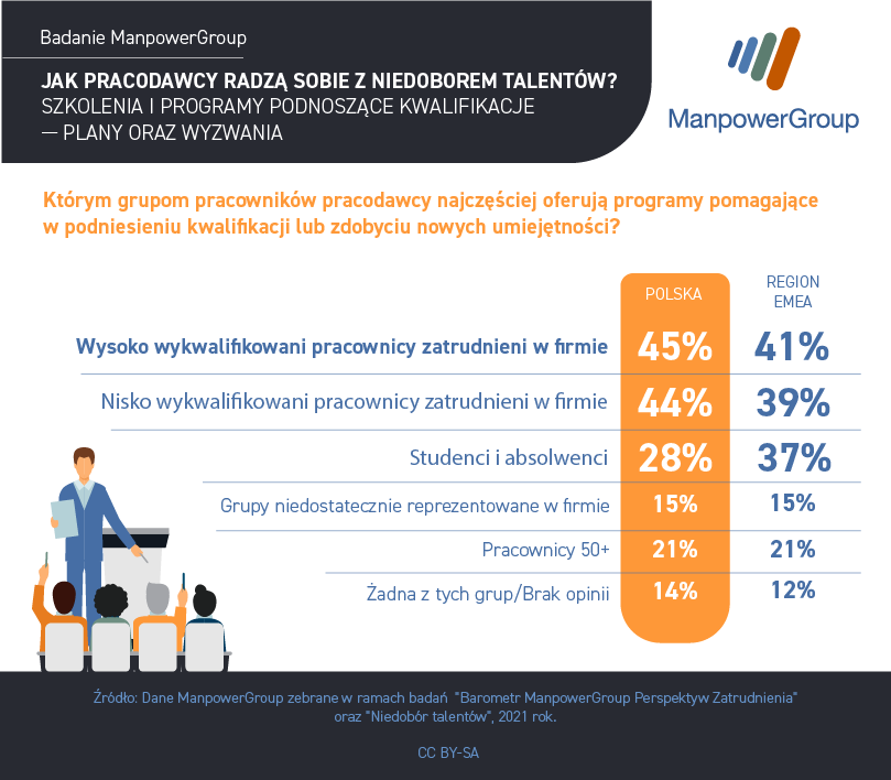 w programach podnoszących kwalifikacje mają natomiast studenci oraz absolwenci, będący dopiero na początku swojej ścieżki zawodowej. W ich rozwój inwestuje zaledwie 28% pracodawców. Podobnie jest w przypadku pracowników 50+ oraz grup niedostatecznie reprezentowanych