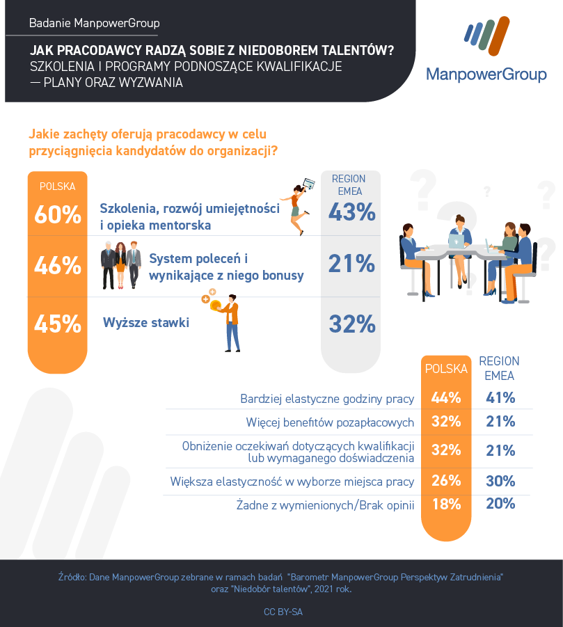 W dobie największego od 15 lat niedoboru talentów pozyskanie wykwalifikowanych pracowników jest dużym wyzwaniem dla firm. W celu przyciągnięcia kandydatów pracodawcy wprowadzają więc różnorodne zachęty - należą do nich między innymi elastyczne godziny pracy, większa liczba benefitów pozapłacowych, wyższe stawki czy systemy poleceń. Mają one pomóc organizacjom w pozyskaniu najlepszych pracowników. Jakie rozwiązania są najpopularniejsze w Polsce i czy różnią się od tych najczęściej stosowanych przez firmy w regionie EMEA? Odpowiedzi na te pytania prezentuje
