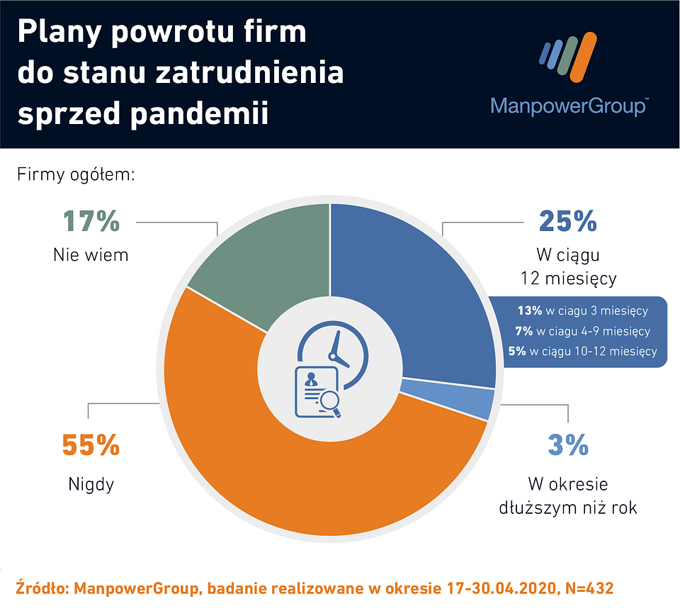 - Fakt, że 55% firm nie planuje powrotu do stanu zatrudnienia sprzed Covidu może wynikać z wielu czynników. Przedsiębiorstwa nie wiedzą, czy w przyszłości uda im się osiągnąć podobny poziom produkcji lub skalę prowadzonego biznesu. Może być to również związane z szukaniem innych rozwiązań jak wprowadzenie automatyzacji czy dywersyfikacji portfela usług, na którym działają - mówi Tomasz Walenczak, dyrektor Manpower. - Firmy szukają również sposobów, które pozwolą im na wygenerowanie oszczędności bez konieczności redukowania zespołów. Wiedzą, że kiedy zapotrzebowanie na ich produkty lub usługi wróci do wcześniejszego poziomu będą musiały szybko odpowiedzieć na potrzeby klientów. Tak samo elastycznie, jak reagowały na pierwsze wyzwania, które pojawiły się w momencie wystąpienia pandemii w Polsce, także na poziomie zarządzania zespołami i procesami. Pewien odsetek organizacji, które nie przewidują powrotu do wcześniejszego stanu zatrudnienia może planować przeniesienie części zasobów kadrowych lub procesów do zewnętrznych dostawców, aby móc w większym stopniu korzystać z elastycznych form zatrudnienia, które szczególnie w świetle ostatnich miesięcy zyskały. Podobnie zmienia się podejście pracodawców w zakresie strategii zarządzania talentami, w tym reskillingu i upskillingu pracowników, by budować wewnątrz organizacji zespoły o potrzebnych w danym momencie kompetencjach. Z pandemią lepiej poradziły sobie te firmy, które potrafiły dynamicznie odpowiedzieć na zmiany i przystosować się do nowej rzeczywistości. Z pewnością na tak wysoki odsetek negatywnych wskazań miał też wpływ czas przeprowadzenia badania, czyli połowa kwietnia, który był okresem funkcjonowania wielu ograniczeń w prowadzeniu działalności - uzupełnia ekspert Manpower.