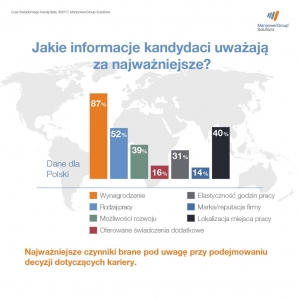 (40% w Polsce i 34% globalnie), które zamyka pierwszą trójkę. Na kolejnych, wymienianych przez kandydatów miejscach, znalazły się możliwości rozwoju (39% wskazań, zarówno w Polsce, jak i na świecie), a także elastyczność godzin pracy (31% w Polsce i 38% na świecie). Oferowane świadczenia dodatkowe, jak i marka pracodawcy to czynniki, które są istotne, ale wskazywane są na końcu przez polskich kandydatów (odpowiednio 16% i 14%), podczas gdy w ujęciu globalnym posiadają mocniejszą pozycję (odpowiednio 38% i 20%).