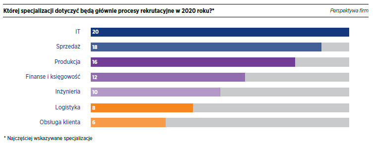 Zatrudnienie nowych pracowników jest uwzględnione w planach 84% firm. Wciąż jest to wysoki odsetek, choć liczba rekrutacji w 2020 będzie mniejsza niż w roku ubiegłym. Podobnie jak w 2019, również na nadchodzące miesiące pracodawcy przewidują największe zapotrzebowanie na specjalistów IT, sprzedaży, produkcji, finansów oraz inżynierii. Ponadto wskazują, że szczególnie potrzebne będą osoby związane z inżynierią, logistyką oraz obsługą klienta.