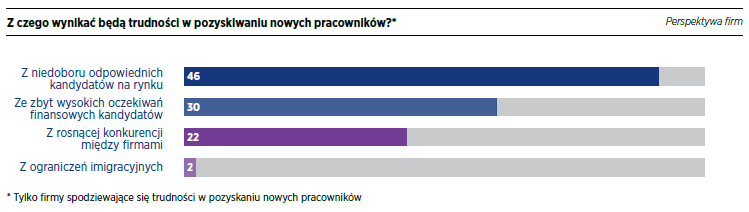 Obok planów utrzymania bądź zwiększenia poziomu zatrudnienia, rosną wyzwania w rekrutacji. Konkurencja o najlepszych pracowników jest naprawdę duża. Trudności spodziewa się mniejszy odsetek pracodawców niż w roku ubiegłym, ale nadal jest to ponad 80 proc. firm. Głównym winowajcą jest niedobór odpowiednich kandydatów na rynku oraz wygórowane oczekiwania finansowe, dyktowane nawet przez osoby stawiające swoje pierwsze kroki w karierze.