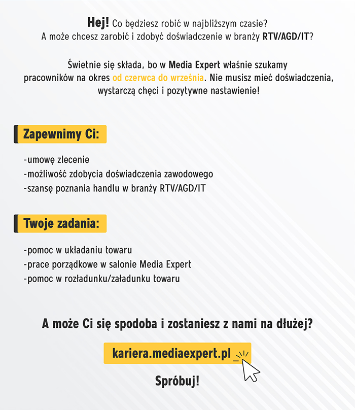 Świetnie się składa, bo w Media Expert właśnie szukamy pracowników na okres od czerwca do września. Nie musisz mieć doświadczenia, wystarczą chęci i pozytywne nastawienie!