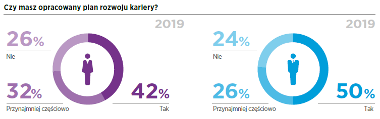 Zadowolenie z obecnej pracy nie powoduje jednak, że aspiracje panów są mniejsze niż w latach ubiegłych lub wobec ambicji kobiet. Mężczyźni mierzą wysoko i dążą do objęcia stanowiska dyrektorskiego (20 proc), zarządczego bądź właścicielskiego (38 proc). Ambicja to jednak nie wszystko. Mężczyźni coraz bardziej świadomie planują swoje zawodowe kariery. W tym roku aż 74 proc. mężczyzn deklaruje posiadanie przynajmniej częściowo opracowanej strategii rozwoju. Panowie deklarują także możliwość komunikowania swoich celów zawodowych na obecnie zajmowanym stanowisku i otwartej rozmowy z przełożonym. Ponad połowa uczestników tegorocznego badania potwierdza, że ma swobodną możliwość mówienia o swoich ambicjach. W konsekwencji mężczyźni mają poczucie, że ich aspiracje są słyszane - wie o nich bezpośredni przełożony lub osoba mająca wpływ na ścieżkę kariery. Większość panów uważa przy tym, że może liczyć na wsparcie przełożonego w realizacji założonego planu. Najczęściej wsparcie to polega na regularnej ocenie wyników