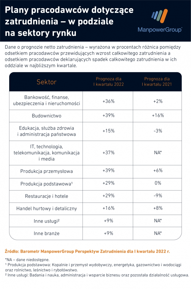 W najbliższym kwartale najwięcej ofert zatrudnienia będzie czekać na osoby zainteresowane pracą w produkcji przemysłowej, gdzie aż 53% firm chce zwiększać zatrudnienie, a tylko 10% zmniejszać liczbę etatów. Sektor produkcji przemysłowej w ostatnich latach był jednym z obszarów z najbardziej optymistycznymi planami rekrutacyjnymi firm, lecz prognoza zatrudnienia +39% jest najwyższą dla tej branży, zarejestrowaną w historii badania w Polsce. Równie duże zapotrzebowanie na nowych pracowników zgłosili przedstawiciele budownictwa (+39%), w którym 46% firm chce zatrudniać nowych pracowników a 11% planuje zmniejszać zespoły. Bardzo dobrych perspektyw zmiany pracy mogą oczekiwać zainteresowani karierą w obszarze IT & technologie, telekomunikacja, komunikacja, media (+37%) a także w sektorze bankowość, finanse, ubezpieczenia i nieruchomości (+36%). We wszystkich 10 przeanalizowanych przez ManpowerGroup obszarach rynku firmy wskazują optymistyczne lub bardzo optymistyczne perspektywy zatrudnienia na najbliższy kwartał.