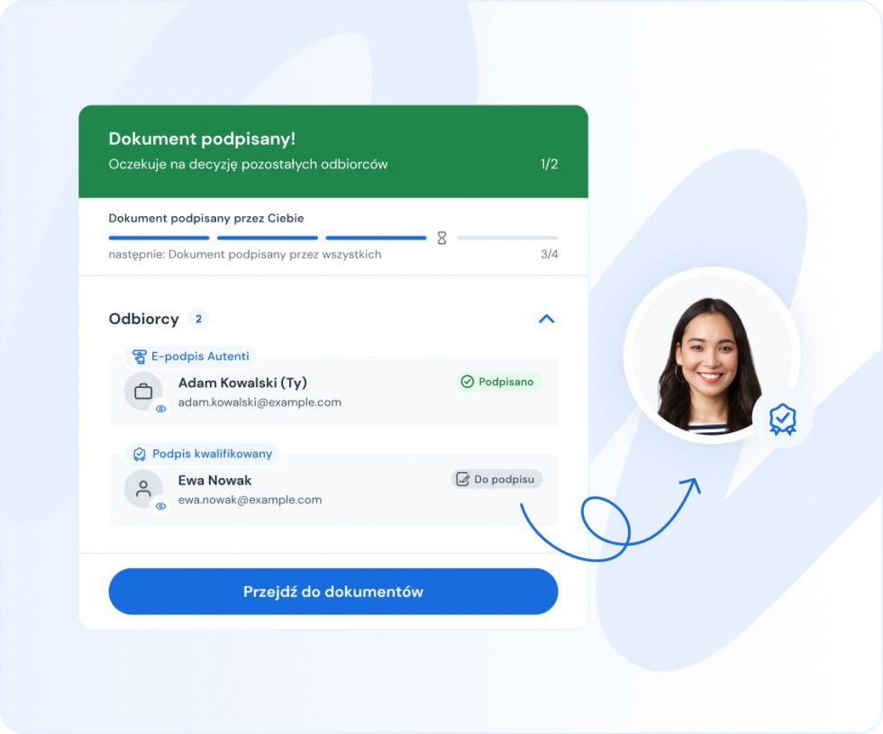 Jeśli proces obejmował weryfikację tożsamości (KYC) przed podpisem, dane weryfikacyjne są częścią dokumentacji. Platforma zintegrowała weryfikację z podpisem - tożsamość jest potwierdzona, nie domniemana.