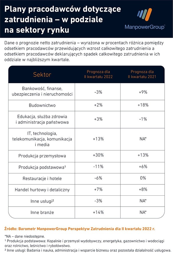 Pomiędzy kwietniem a czerwcem 2022 roku największe zapotrzebowanie na personel zgłaszają przedsiębiorcy reprezentujący sektor produkcji przemysłowej, z prognozą netto zatrudnienia wynoszącą +30%. Chęć intensywnego pozyskiwania nowych talentów prezentują także przedstawiciele IT, technologii, telekomunikacji, komunikacji i mediów (+13%) oraz innych branż (+14%). Nieco bardziej zachowawcze, lecz wciąż pozytywne plany rekrutacyjne deklarują pracodawcy z obszaru handlu hurtowego i detalicznego (+7%) oraz edukacji, służby zdrowia