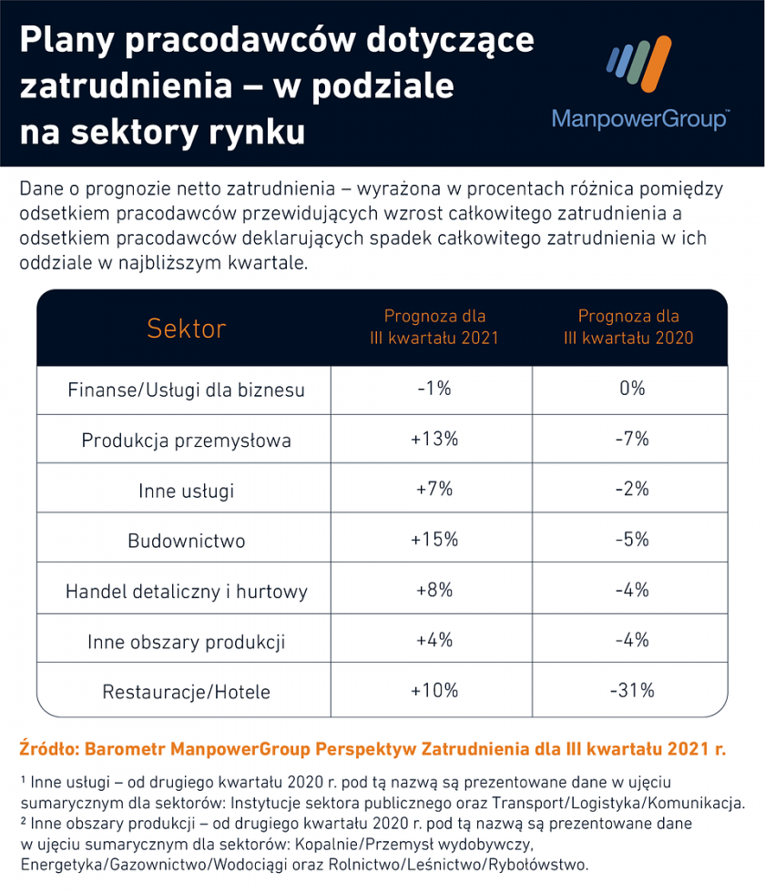 Zgodnie z deklaracjami firm najwięcej nowych rąk do pracy będzie potrzebnych w budownictwie, gdzie prognoza netto zatrudnienia wynosi +15% oraz w produkcji przemysłowej, z prognozą +13%, dla której wynik jest najwyższy od blisko dwóch lat. Odbudowywać swoje zespoły chcą również restauracje i hotele (+10%) oraz firmy działające w sektorze handlu (+8%). Jedynym spośród siedmiu analizowanych sektorów,