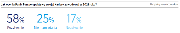 Pomimo zmian i wciąż trudnej do przewidzenia, najbliższej przyszłości rynku pracy, większość specjalistów i menedżerów pozytywnie ocenia perspektywę swojej kariery zawodowej w 2021. Wśród największych optymistów znajdują się osoby związane z obszarem IT, badaniami