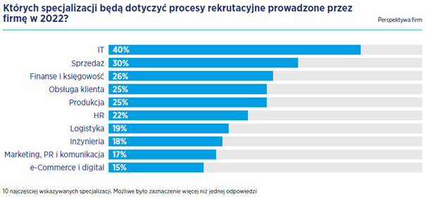 Pracodawcy zapytani o specjalizacje, których dotyczyć będą prowadzone przez nich rekrutacje, najczęściej wskazują IT (40 proc. firm), sprzedaż (30 proc.), finanse i księgowość (26 proc.) oraz obsługę klienta i produkcję (po 25 proc.). Wyniki badania jednoznacznie pokazują, iż rok 2022 będzie czasem kontynuacji trendu wysokiej aktywności rekrutacyjnej firm. Plany te mogą jednak zostać zweryfikowane przez kolejne fale pandemicznych obostrzeń, głównie w sektorach szczególnie narażonych na ich wdrożenie, i niesprzyjające inwestycjom wskaźniki makroekonomiczne.