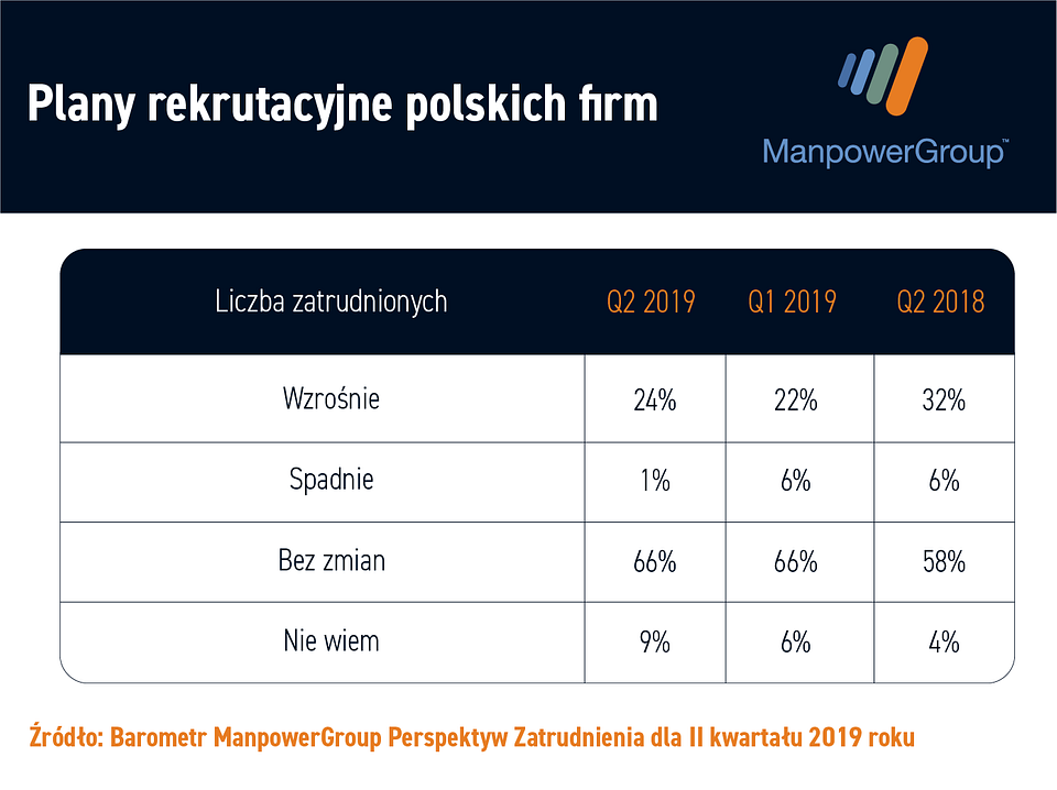 Dane wskazują, że 24% pracodawców zgłasza chęć powiększania swoich zespołów od kwietnia do czerwca bieżącego roku. 66% przebadanych firm nie przewiduje zmian w liczbie pracowników, a tylko 1% planuje redukcję etatów. Odsetek pracodawców, którzy planują zwiększyć zatrudnienie wzrósł