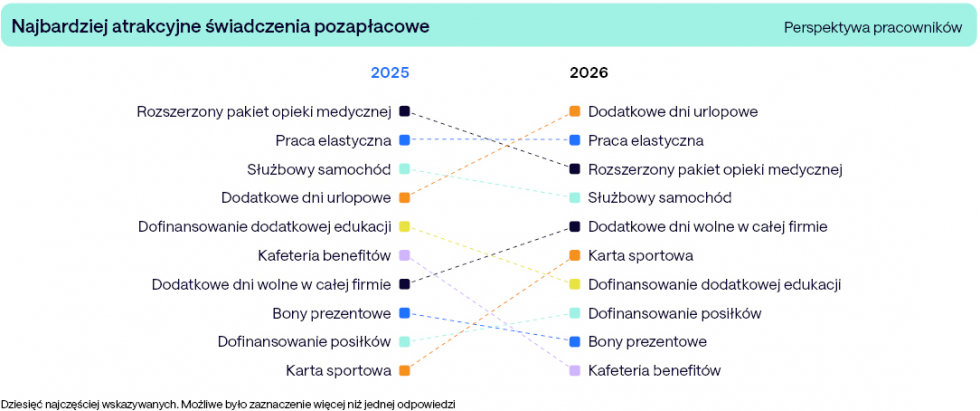 A tych do wyboru jest wiele. Z tegorocznej edycji raportu wynika, że te, na których zależy pracownikom najbardziej to: dodatkowe dni urlopowe, które na przestrzeni roku przesunęły się