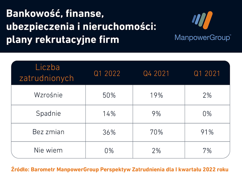 Co druga firma z sektora bankowości, finansów, ubezpieczeń i nieruchomości chce w pierwszym kwartale 2022 roku zatrudniać nowych pracowników - potwierdzają dane ManpowerGroup.