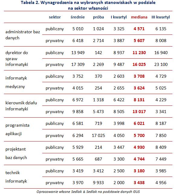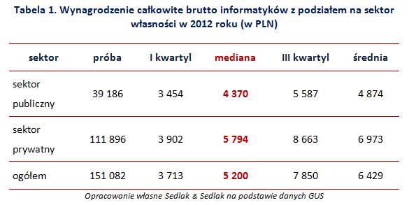 Opublikowane w 2014 roku dane z przeprowadzonego przez GUS badania "Struktura wynagrodzeń według zawodów w październiku 2012 roku" zawierają informacje o zatrudnieniu i wynagrodzeniach na poszczególnych stanowiskach w sektorach: prywatnym i publicznym. Według tego badania w 2012 roku na stanowiskach informatycznych zatrudnionych było ponad 151 tys. osób. W gospodarce narodowej (z wyłączeniem mikroprzedsiębiorstw) 26% informatyków stanowili pracujący w sektorze publicznym. Zatrudnienie w budżetówce jest jednak dla specjalisty IT finansowo mniej korzystne niż w prywatnym przedsiębiorstwie. Sektor prywatny płacił tym pracownikom o 33% więcej, niż sektor publiczny.