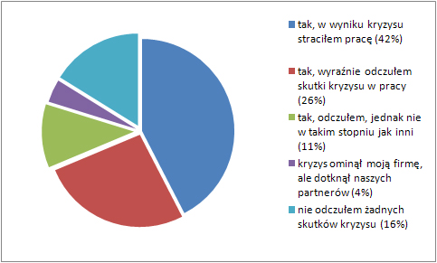 Jedynie 4% respondentów twierdzi, że kryzys ominął ich firmę, ale dotknął ich partnerów natomiast 11% badanych odczuwa go w bardzo małym stopniu. Sytuacja nie jest więc jeszcze zła i nie ma potrzeby martwić się na zapas. Jeśli kryzys naprawdę przyjdzie- wtedy trzeba będzie się przed nim bronić, a na razie- bez obaw.