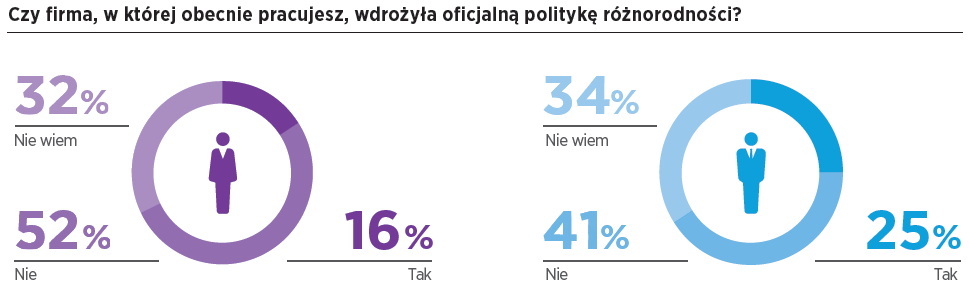 Pracodawcy widzą coraz wyraźniej, że różnorodność w miejscu pracy to nie tylko dobra praktyka czy element odpowiedzialnego biznesu, ale też lepsze wyniki i kondycja spółki. Niestety obok 34 proc. kobiet oraz 14 proc. mężczyzn, którzy przynajmniej w pewnym stopniu zgadzają się ze stwierdzeniem, iż ich firma boryka się z brakiem różnorodności lub nierównymi szansami na awans, pracownicy bardzo często nie wiedzą, czy w ich miejscu pracy funkcjonuje oficjalna polityka w zakresie różnorodności.