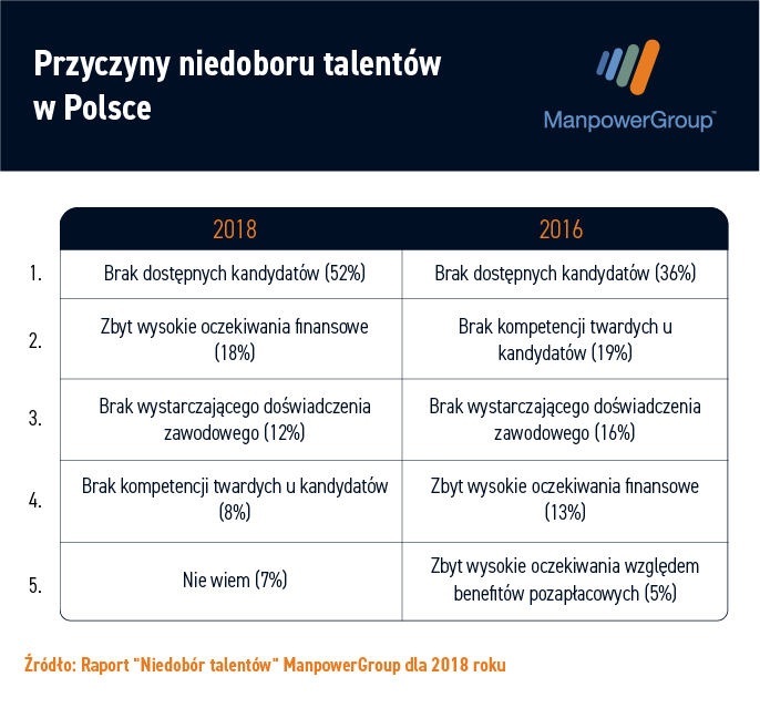 52% polskich firm uważa, że głównym powodem, dla którego nie mogą obsadzić nowych miejsc pracy jest brak dostępnych kandydatów (źródło: 'Niedobór talentów', raport ManpowerGroup). Kolejne 18% twierdzi, że wynika to ze zbyt wysokich oczekiwań finansowych potencjalnych pracowników.