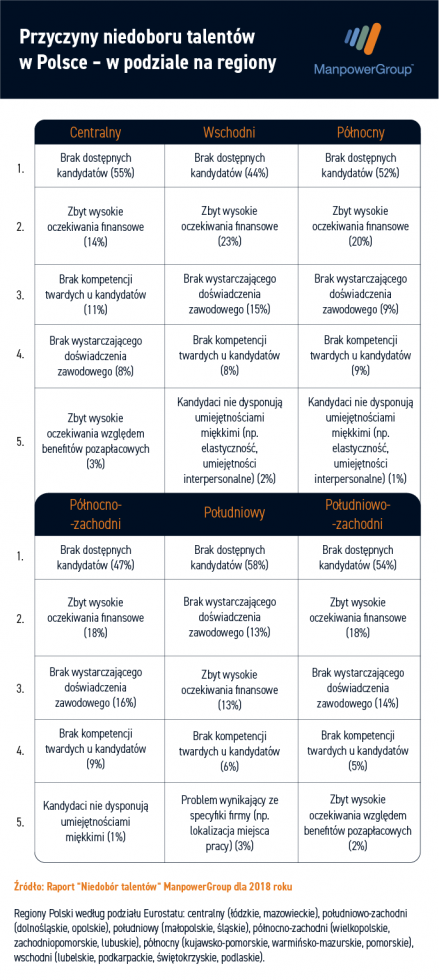 w obsadzaniu stanowisk. W czterech na sześć regionów na ten problem wskazuje ponad połowa pracodawców, najwięcej w Polsce południowej (58%), najmniej na wschodzie (44%). Z drugiej strony to właśnie na wchodzie najwyższy odsetek firm mówi o zbyt wysokich oczekiwaniach finansowych kandydatów - 23%, na drugim biegunie jest Polska południowa z wynikiem 13%. Ciekawe różnice pomiędzy regionami widoczne są również w przypadku firm, które sygnalizują brak wystarczającego doświadczenia kandydatów (16% dla północno-zachodniego vs. 8% dla centralnego regionu) i brak wymaganych kompetencji twardych (11% dla centralnej vs. 5% dla południowo-zachodniej Polski).